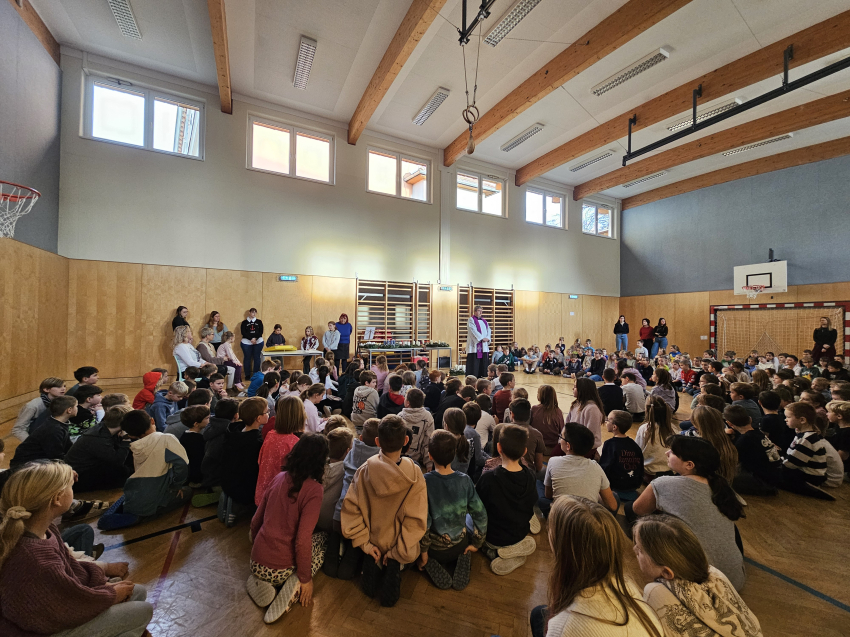 Am Freitag, 5. Dezember besuchte der BISCHOF NIKOLAUS unsere SchülerInnen aus den ersten und zweiten Klassen. Aufgeregt und voller Freude warteten sie auf das Klopfen und die schweren Schritte des Bischofs im geschmückten Turnsaal. Mit schönen Liedern und entzückenden Gedichten wurde er in einer stimmungsvollen Feier von den Kindern beschenkt. Die Lehrerinnen halfen ihm, die schweren Körbe mit liebevollen Nikolaussackerl zu tragen. Bestimmt kommt er im nächsten Jahr wieder zu Besuch!