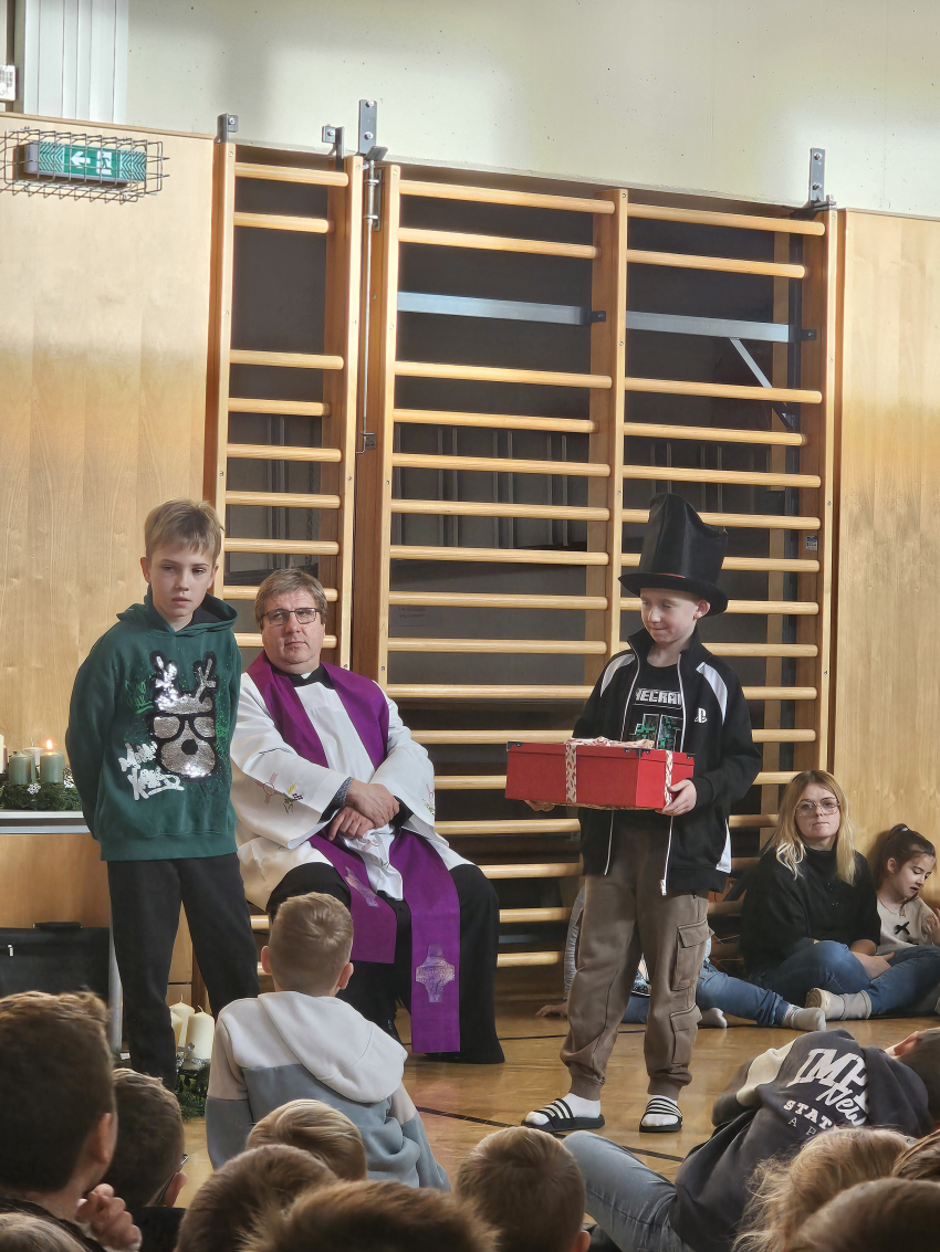 Am 1. Dezember 2025 kam Pfarrer Mathias Trawka zu uns in die Volksschule, um die Adventkränze unserer Schule zu segnen. Danach hörten wir die Geschichte vom „roten Paket“. Das rote Paket ist ein Geheimnis, man darf es nicht öffnen, man darf es nur weiterschenken. Mit jeder Weitergabe werden gute Wünsche mit auf den Weg gegeben. Auch die Kinder möchten in dieser Adventzeit mitmachen und anderen Glück, Wertschätzung, Gesundheit, Frieden … schenken. Seitdem wandert auch in unserer Schule ein rotes Paket von Klasse zu Klasse, um gute Wünsche zu sammeln. Diese Wünsche werden wir beim Weihnachtsgottesdienst Jesus, dem „Geschenk Gottes“ an uns Menschen, bringen.