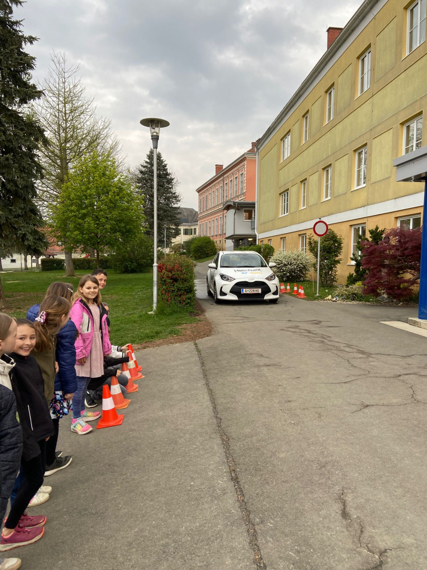 Die Buben und Mädchen konnten selbst ein Auto zum Stehen bringen, indem sie die Bremse bei dem dafür umgebauten Wagen betätigen durften. Sie sahen und spürten, dass selbst eine Notbremsung das Auto nicht sofort zum Stillstand bringt.