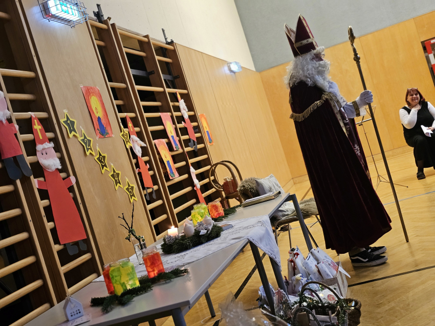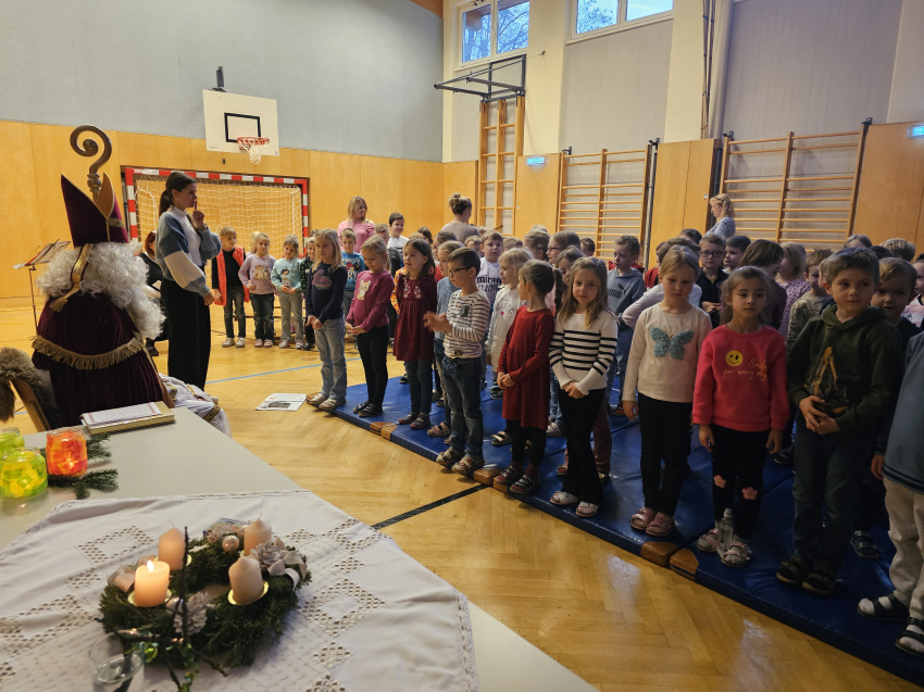 Am Freitag, 5. Dezember besuchte der BISCHOF NIKOLAUS unsere SchülerInnen aus den ersten und zweiten Klassen. Aufgeregt und voller Freude warteten sie auf das Klopfen und die schweren Schritte des Bischofs im geschmückten Turnsaal. Mit schönen Liedern und entzückenden Gedichten wurde er in einer stimmungsvollen Feier von den Kindern beschenkt. Die Lehrerinnen halfen ihm, die schweren Körbe mit liebevollen Nikolaussackerl zu tragen. Bestimmt kommt er im nächsten Jahr wieder zu Besuch!
