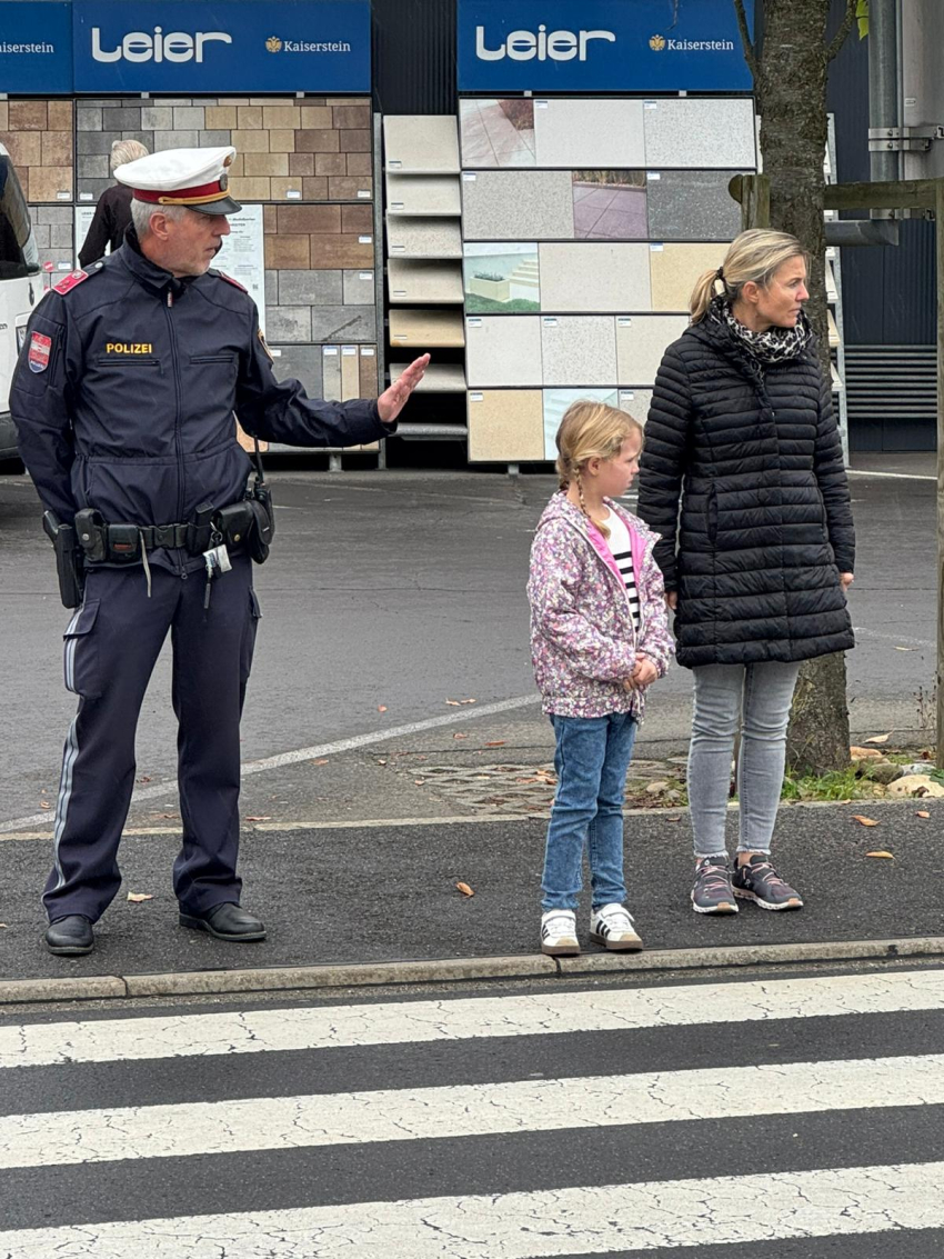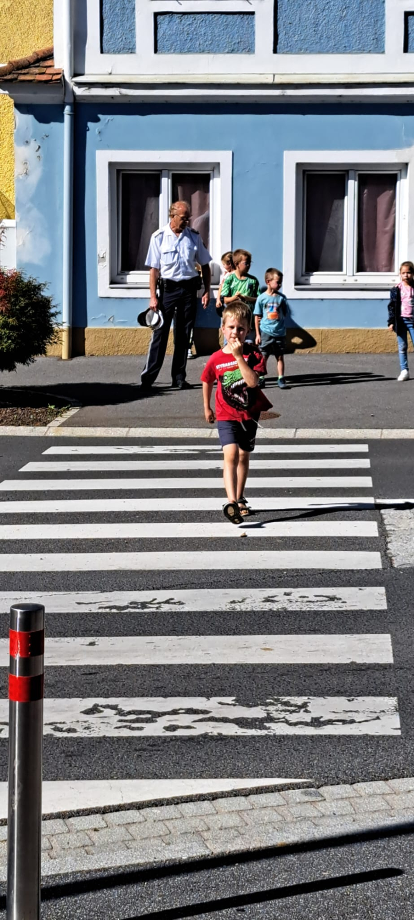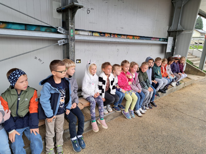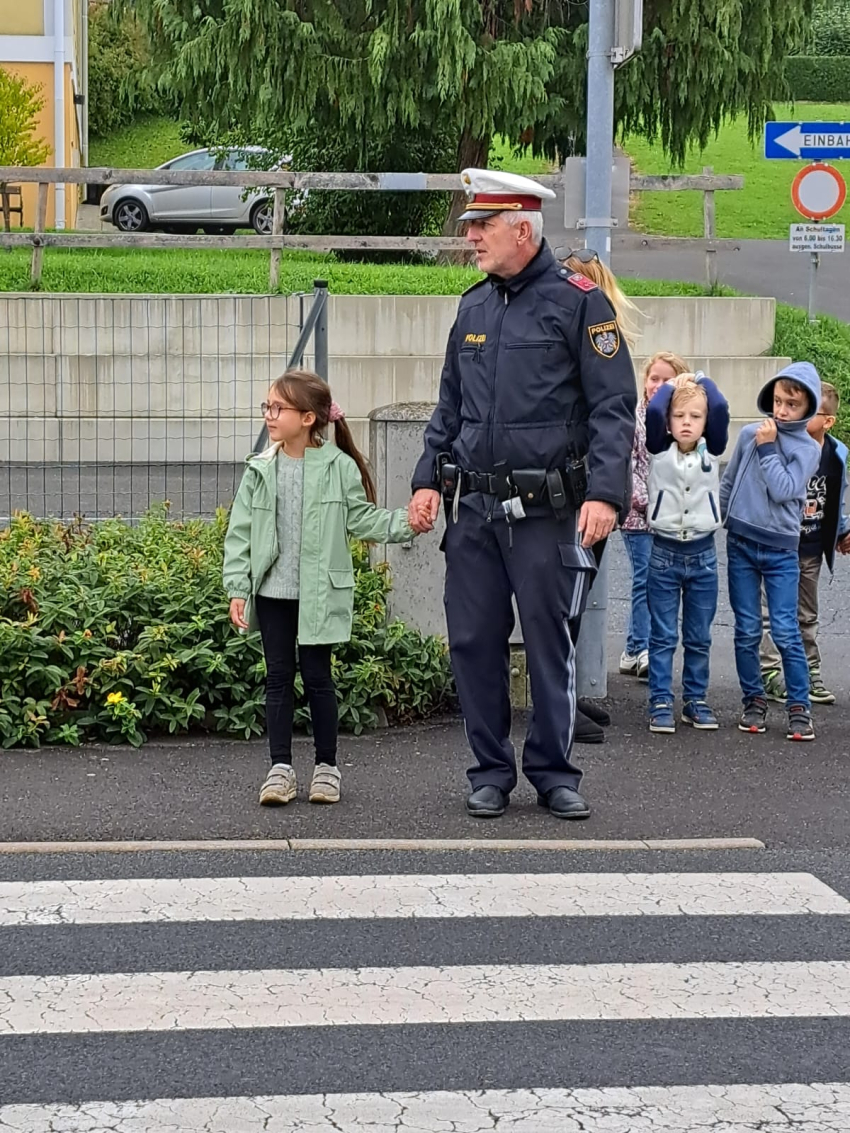In den ersten Schulwochen machten wir gemeinsam mit der Polizei einen Lehrausgang zum Thema Verkehrssicherheit. Die Kinder lernten, wie man die Straße sicher überquert: zuerst stehen bleiben, nach links und rechts schauen und erst dann losgehen. Besonders geübt wurde auch das richtige Verhalten am Busplatz. Die PolizistInnen erklärten wichtige Regeln, damit alle Kinder sicher ein- und aussteigen können. Mit viel Freude und Aufmerksamkeit setzten die Kinder das Gelernte um und zeigten, dass sie schon richtige Verkehrsexperten sind.