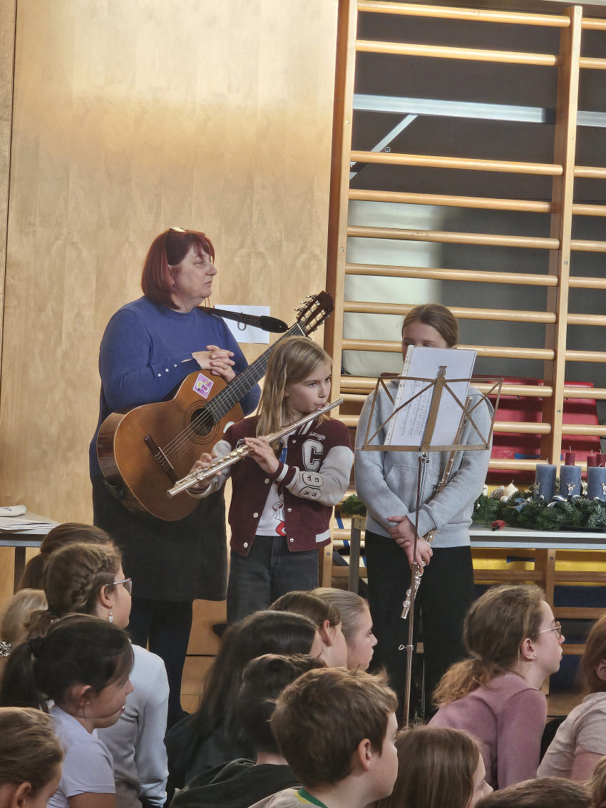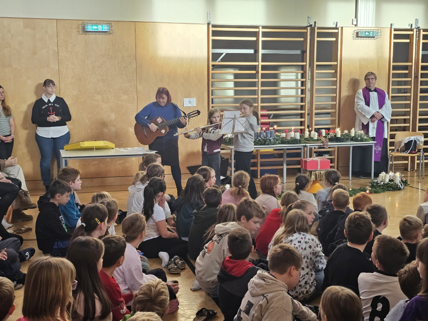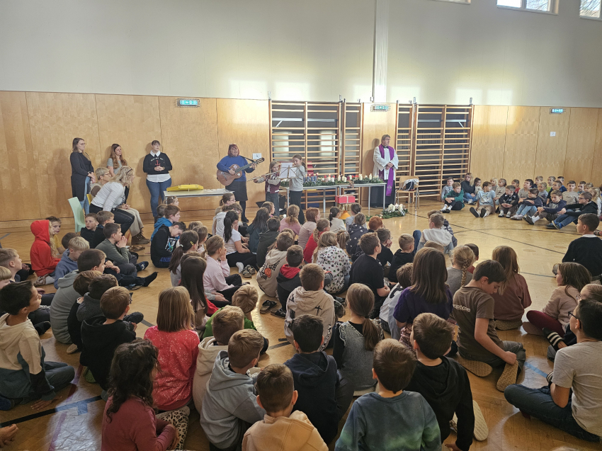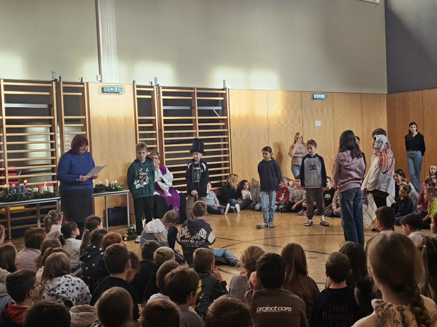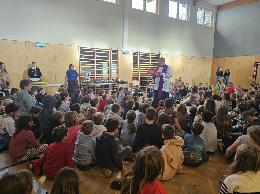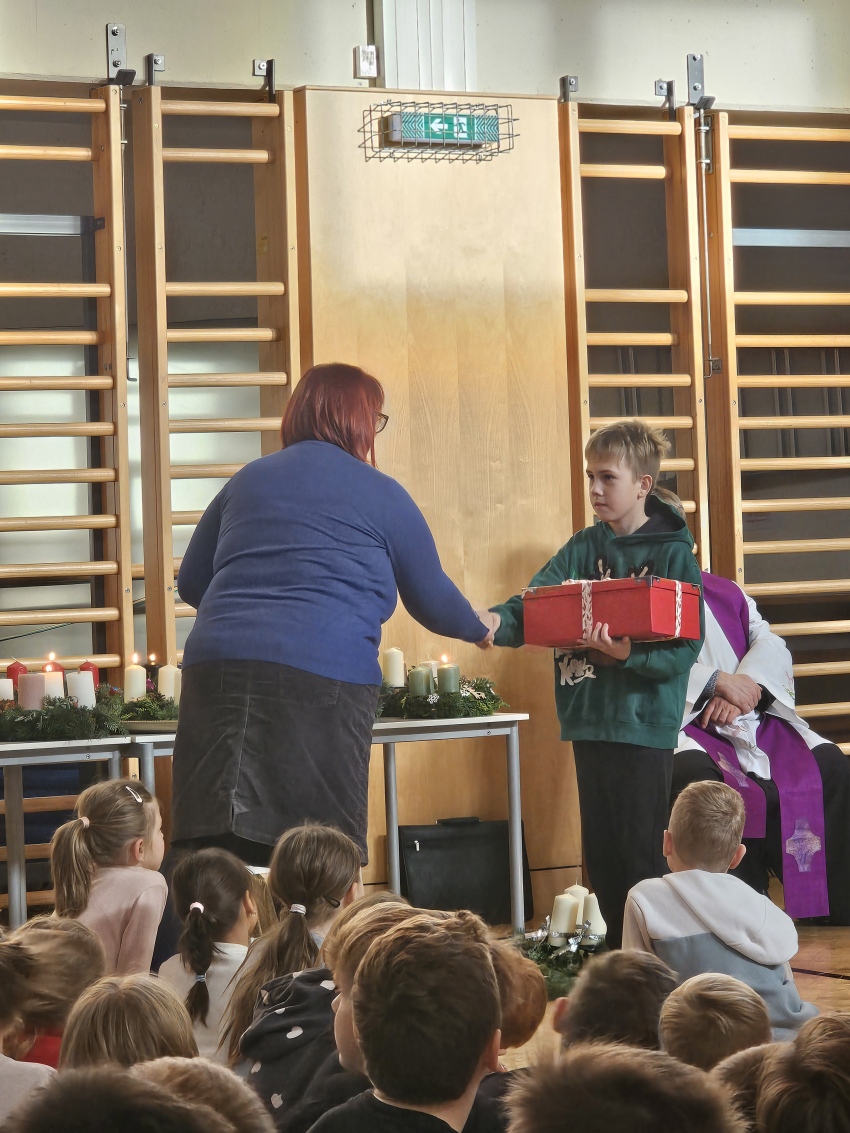 Am 1. Dezember 2025 kam Pfarrer Mathias Trawka zu uns in die Volksschule, um die Adventkränze unserer Schule zu segnen. Danach hörten wir die Geschichte vom „roten Paket“. Das rote Paket ist ein Geheimnis, man darf es nicht öffnen, man darf es nur weiterschenken. Mit jeder Weitergabe werden gute Wünsche mit auf den Weg gegeben. Auch die Kinder möchten in dieser Adventzeit mitmachen und anderen Glück, Wertschätzung, Gesundheit, Frieden … schenken. Seitdem wandert auch in unserer Schule ein rotes Paket von Klasse zu Klasse, um gute Wünsche zu sammeln. Diese Wünsche werden wir beim Weihnachtsgottesdienst Jesus, dem „Geschenk Gottes“ an uns Menschen, bringen.